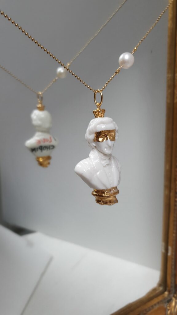 CHOPINWyjątkowe naszyjniki, zawieszki i broszki dla miłośników klasyki. Popiersie Chopina, z których każdemu towarzyszą nuty innego dzieła.