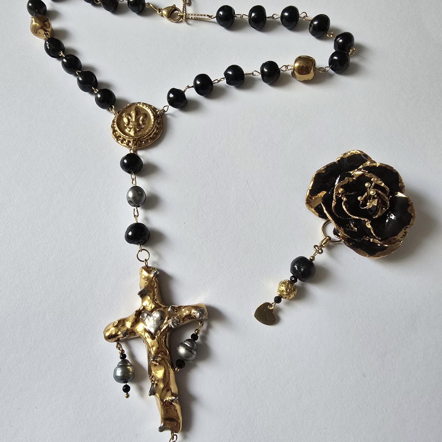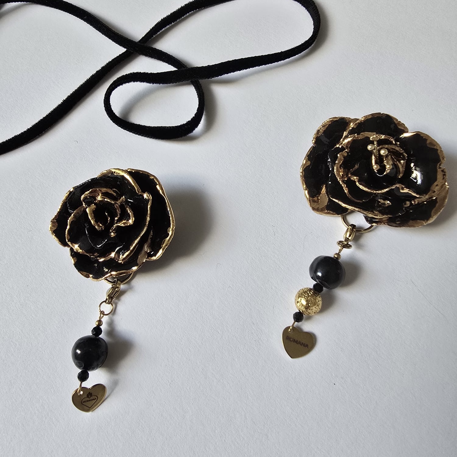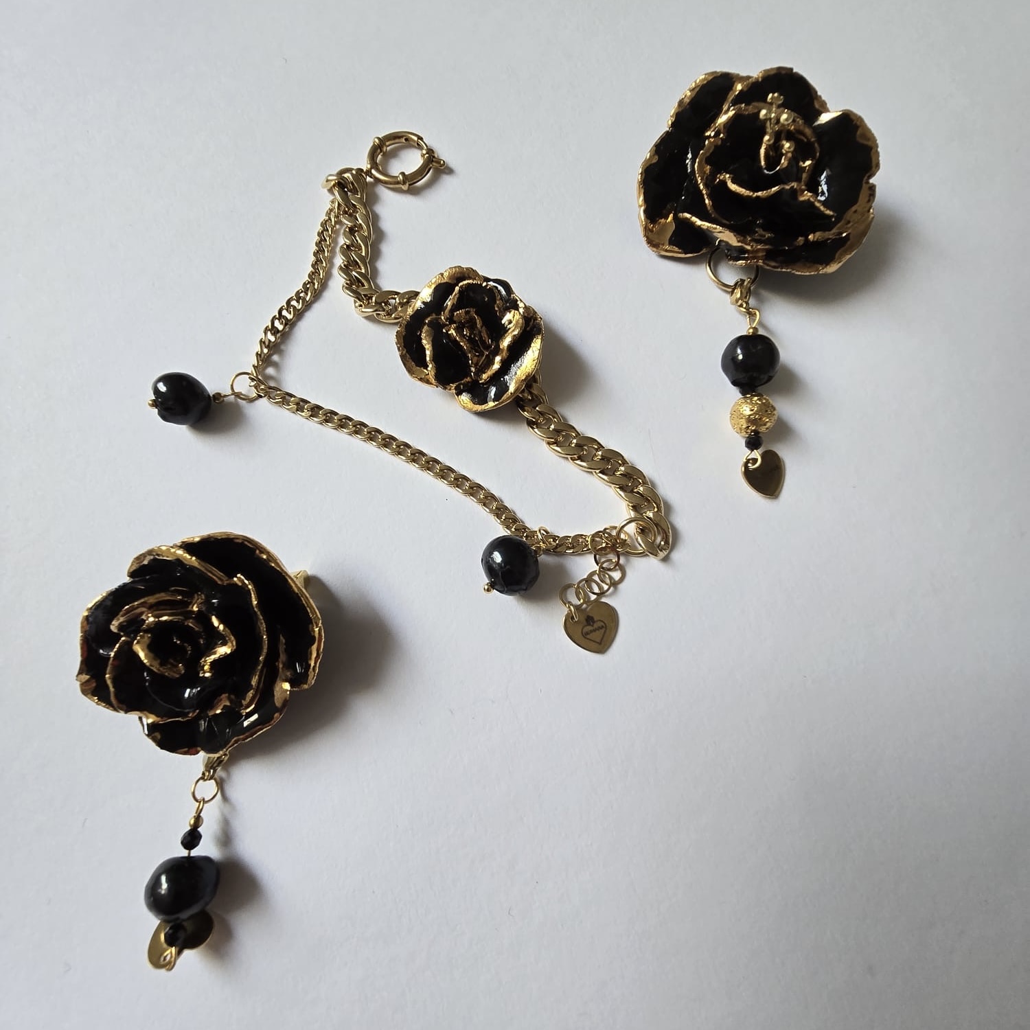 Komplet składa się z naszyjnika na aksamitnej tasiemce, broszki w kształcie róży oraz delikatnego breloka lub zawieszki z czarnymi i złotymi koralikami zakończonymi sercem — znakiem miłości i odwagi.