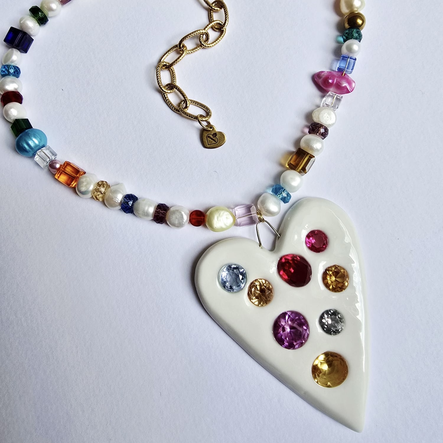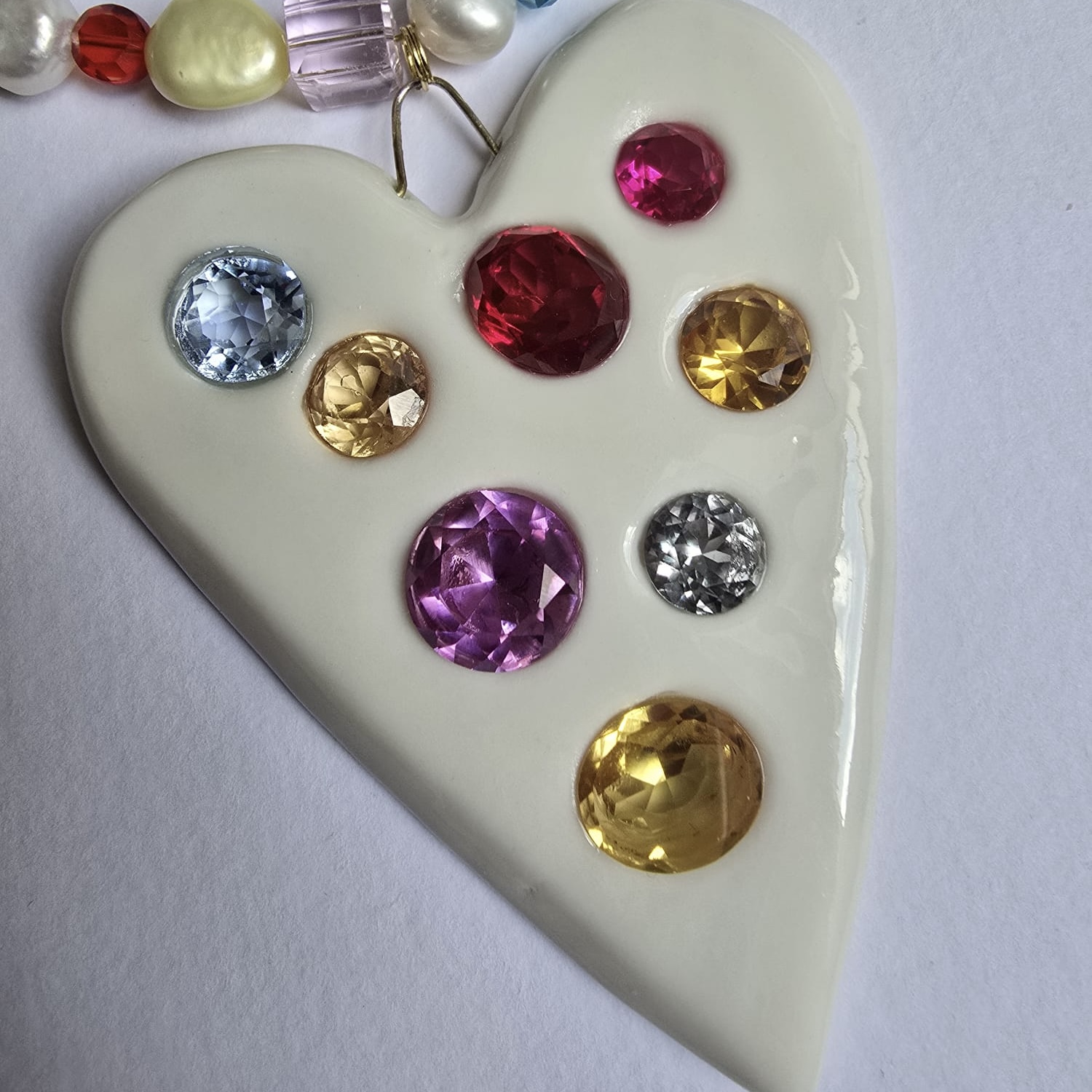Centralnym elementem jest białe ceramiczne serce ozdobione wielobarwnymi kryształami, które pięknie odbijają światło i przyciągają spojrzenia. Kolorowy sznur z perłami, szklanymi koralikami i złotymi detalami tworzy harmonijną, ale pełną życia kompozycję.