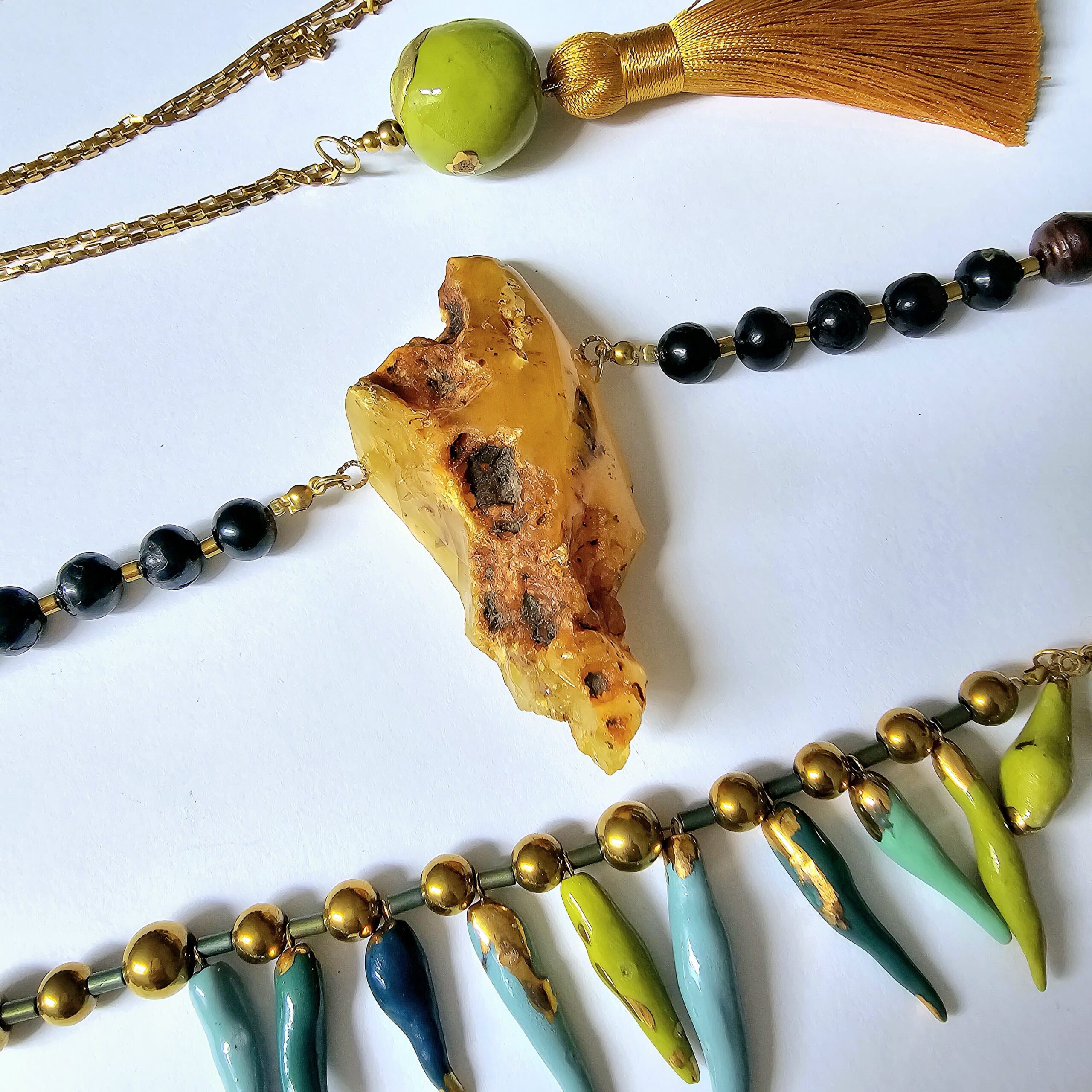 Ten wyjątkowy naszyjnik łączy w sobie delikatność ręcznie formowanej porcelany z naturalnym pięknem bursztynu bałtyckiego. Każdy element jest starannie wykonany, a unikatowa struktura bursztynu sprawia, że nie ma dwóch identycznych egzemplarzy. Ciepłe tony złocistego kamienia pięknie kontrastują z chłodną bielą porcelany, tworząc subtelne, a zarazem wyraziste połączenie.